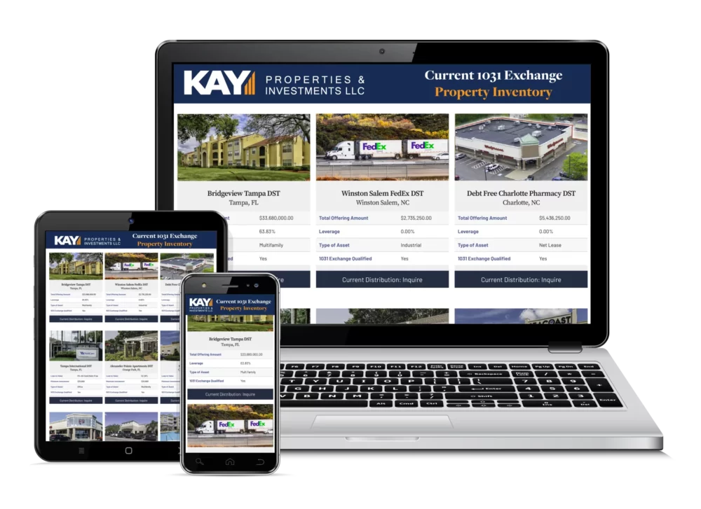 This material does not constitute an offer to sell nor a solicitation of an offer to buy any security. Such offers can be made only by the confidential Private Placement Memorandum (the “Memorandum”). Please read the entire Memorandum paying special attention to the risk section prior investing. IRC Section 1031, IRC Section 1033 and IRC Section 721 are complex tax legal codes therefore you should consult your tax or legal professional for details regarding your situation. There are material risks associated with investing in real estate securities including illiquidity, vacancies, general market conditions and competition, lack of operating history, interest rate risks, general risks of owning/operating commercial and multifamily properties, financing risks, potential adverse tax consequences, general economic risks, development risks and long hold periods. There is a risk of loss of the entire investment principal. Past performance is not a guarantee of future results. Potential cash flow, potential returns and potential appreciation are not guaranteed. By visiting the KPI1031.com site, other affiliated websites, or corresponding on pages herwithin, you are opting for communications on behalf of Kay Properties and Investments, or its affiliated companies.